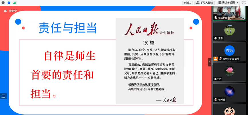 为了从严从紧做好疫情防控工作,从细从实落实学校对校园疫情防控工作的再动员再部署,6月14日中午,开云手机站登录入口党总支副书记、院长张红星通过腾讯会议,在线为全院近900名师生再上一堂疫情防控“大思政课”。