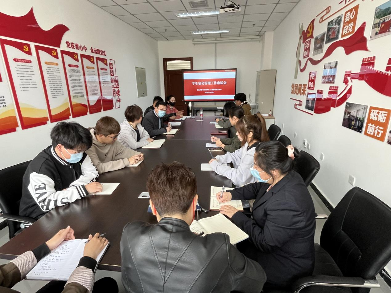 食品学院学工队伍教师与公寓管理中心老师和楼长,就日常管理和驻楼工作进行了深入的讨论,共同探讨如何提升学生宿舍管理效能和服务水平。
