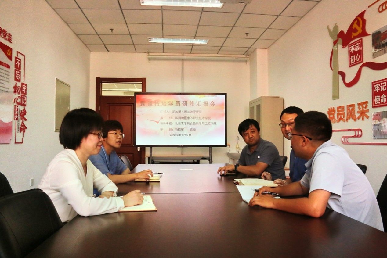 来自新疆和田地区中等职业技术学校的尼加提·图尔迪麦麦提汇报了近一年研修的学习情况和收获。他表示,在北京农学院期间,和学院师生共同学习,积极参加学习贯彻习近平新时代中国特色社会主义思想主题教育,理论水平、业务能力均得到全面提升,收获颇多。特别是在马挺军教授的悉心指导下,学术能力提升很快,增强了自己干事创业的底气。食品学院对他的关心和帮助,让他在远离家乡时,仍然感到了像家一样的温暖,内心充满感激。