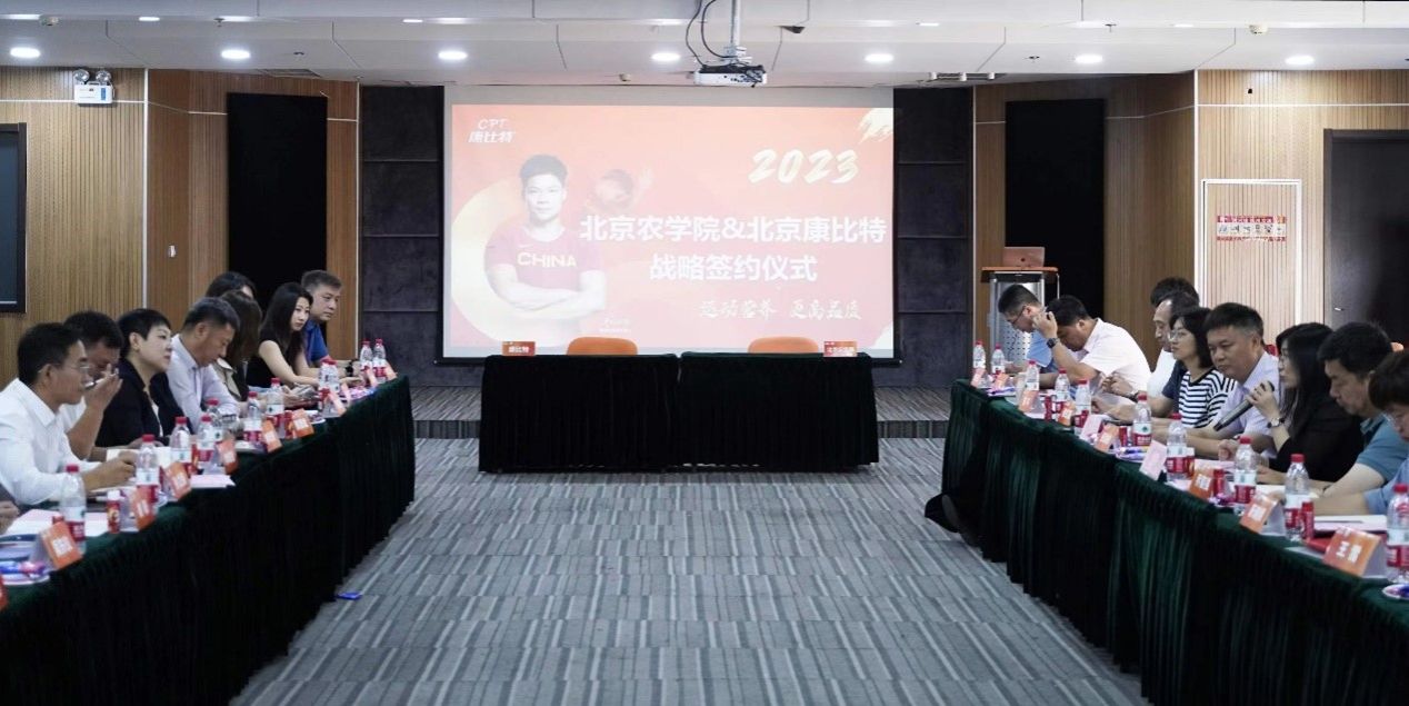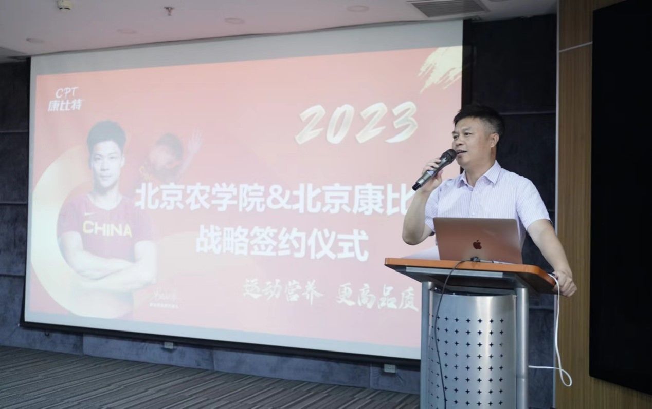 张劲柏为签约仪式致辞。他表示,北京农学院高度重视校企合作、产学研融合工作,自5月份带队到康比特公司访企拓岗以来,双方不断深入互访交流。本次校企战略合作协议的签署,既是新起点,也是新平台。希望双方要进一步发挥校企优势互补、实现合作共赢,共同服务于运动健康食品技术创新和食品行业人才培养。张劲柏对下一步校企合作提出三点要求:一是做实合作,学院要以需求为导向,点对点提供产学研对接服务,加快推进相关项目落地。二是借鉴校企合作成功案例经验,创新合作机制,提升合作效果,不断促进校企产学研合作和科技成果转化。三是双方要立足各自优势,在技术、人才等方面深化交流,培养更多适应行业需求的高素质人才,打造校企合作示范。