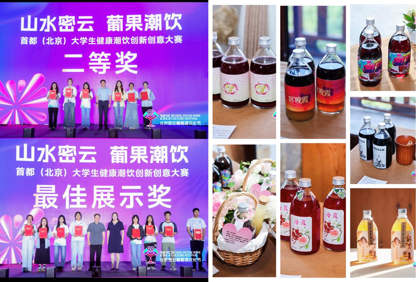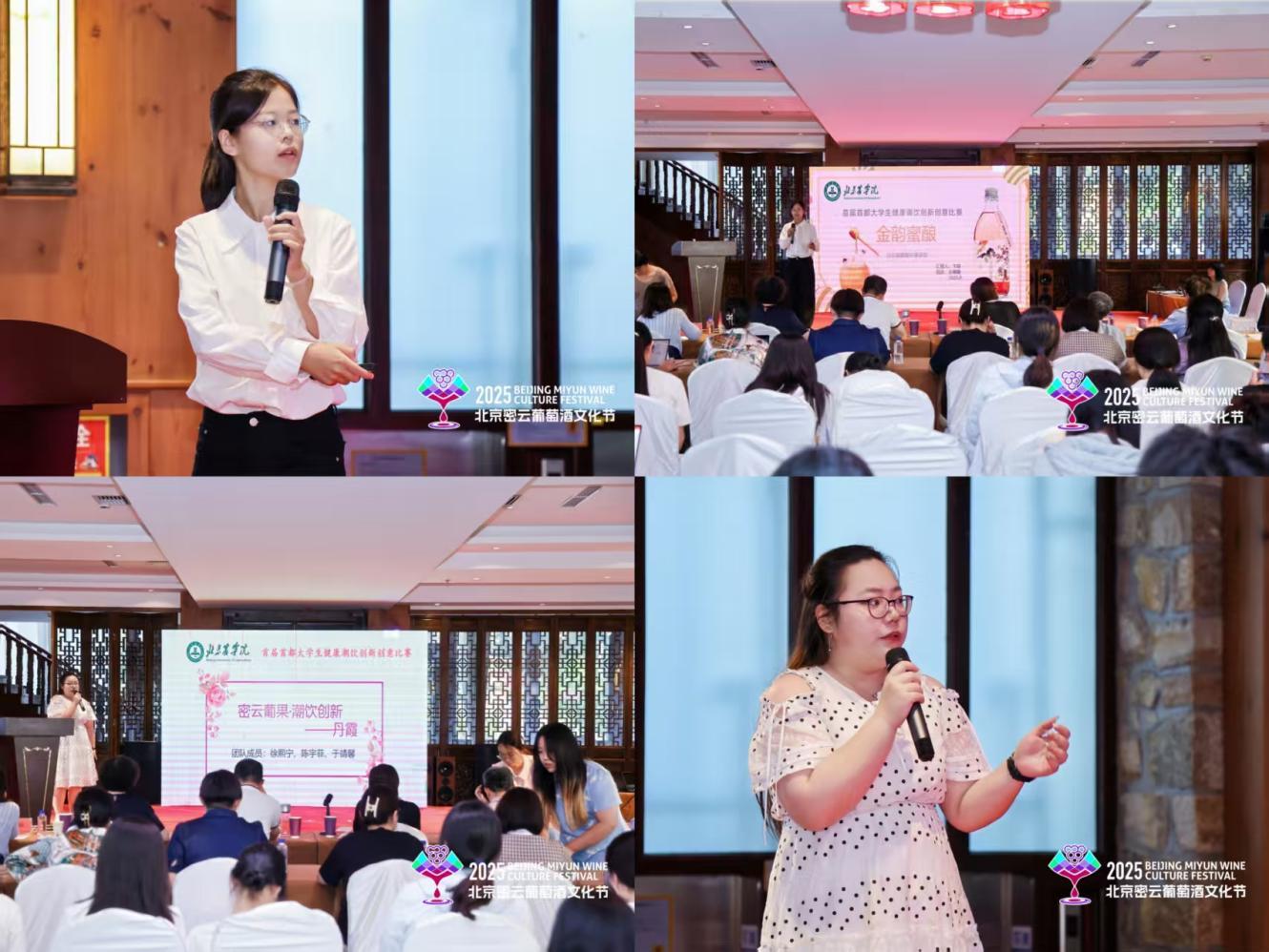大赛自8月启动以来,我校葡萄酒爱好者协会面向全校学生发起征集,得到了酿酒工程、食品质量与安全、投资学等多个专业学生的积极响应。参赛团队严格遵循赛事要求,基于赛事主办方提供的三款基酒,结合密云本地特色农产品,从配方研发、营养分析到包装设计展开全流程创作。经过材料提交、线下答辩等环节,从“产品创意、配方工艺、营养健康价值、市场潜力”四大维度评选出《丹霞》《金韵蜜酿》2支优胜队伍晋级决赛答辩。