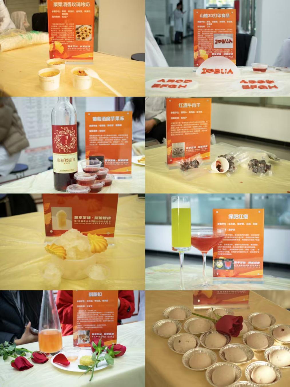 学生作品展示区,栗栗酒香玫瑰烤奶,花椒冰淇淋,豆茉“酥”喉糖,山楂3D打印等创意作品惊艳亮相。展示区俨然成为味觉实验室:草莓芝士爆浆麻薯球实现酸甜平衡,葡萄酒魔芋果冻融合发酵科技,蔬菜华夫塔突破传统食材边界,30余项创意作品构建起“健康+美味”的立体体验空间,让现场师生沉浸式开启了一场跨越味觉边界的美食冒险,尽情感受食品科学的魅力。