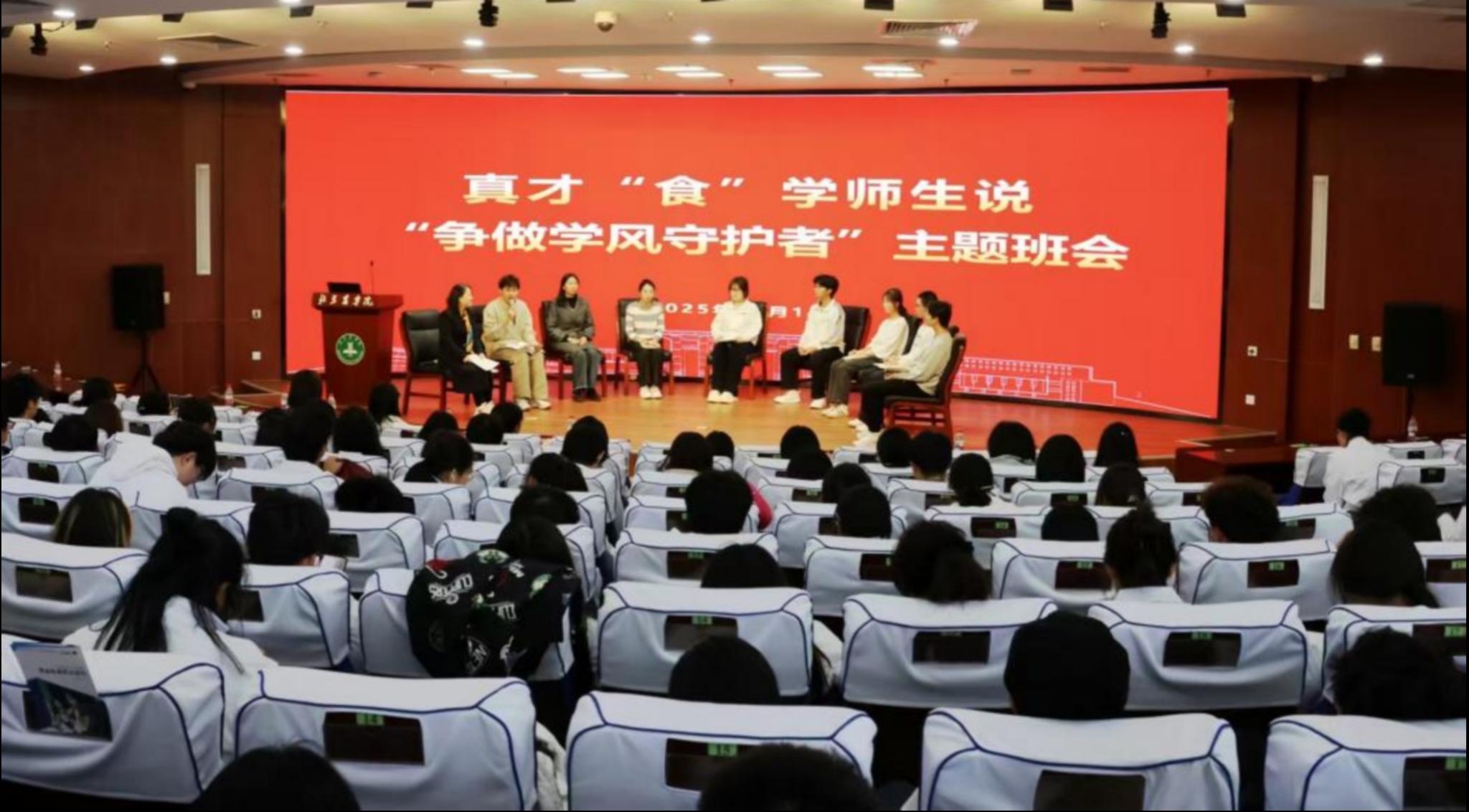 在“真才‘食’学师生说——‘争做学风守护者’主题班会”展示活动中,围绕学院护航、朋辈领航、新生启航,邀请专业教师、班主任、优秀学生代表分别从专业认知、榜样引领、实践养成等多个维度,深入探讨和弘扬优良学风,鼓励大家从自身做起,从每一堂课、每一次实验、每一页笔记做起,争做学风的守护者,为成长成才筑牢根基,为学院和学校的发展贡献青春力量。