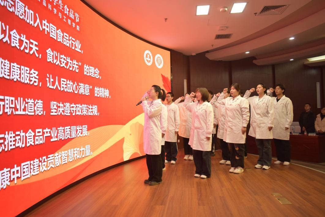 学院党委副书记、院长张红星在致辞中提出,要聚焦食品营养本质与健康功能,以科技创新驱动健康饮食新风尚,期望通过举办食品节,进一步激发同学们探索食品科学前沿的热情,锤炼创新实践能力,将课堂所学与产业所需、人民所盼紧密结合。新生代表孟畅沁珂表示要认真学习每一门课程,夯实专业素养的同时提升解决实际问题的技能水平。新入职教师李希羽博士带领239名新生进行入行宣誓,开启食品人的使命征程。