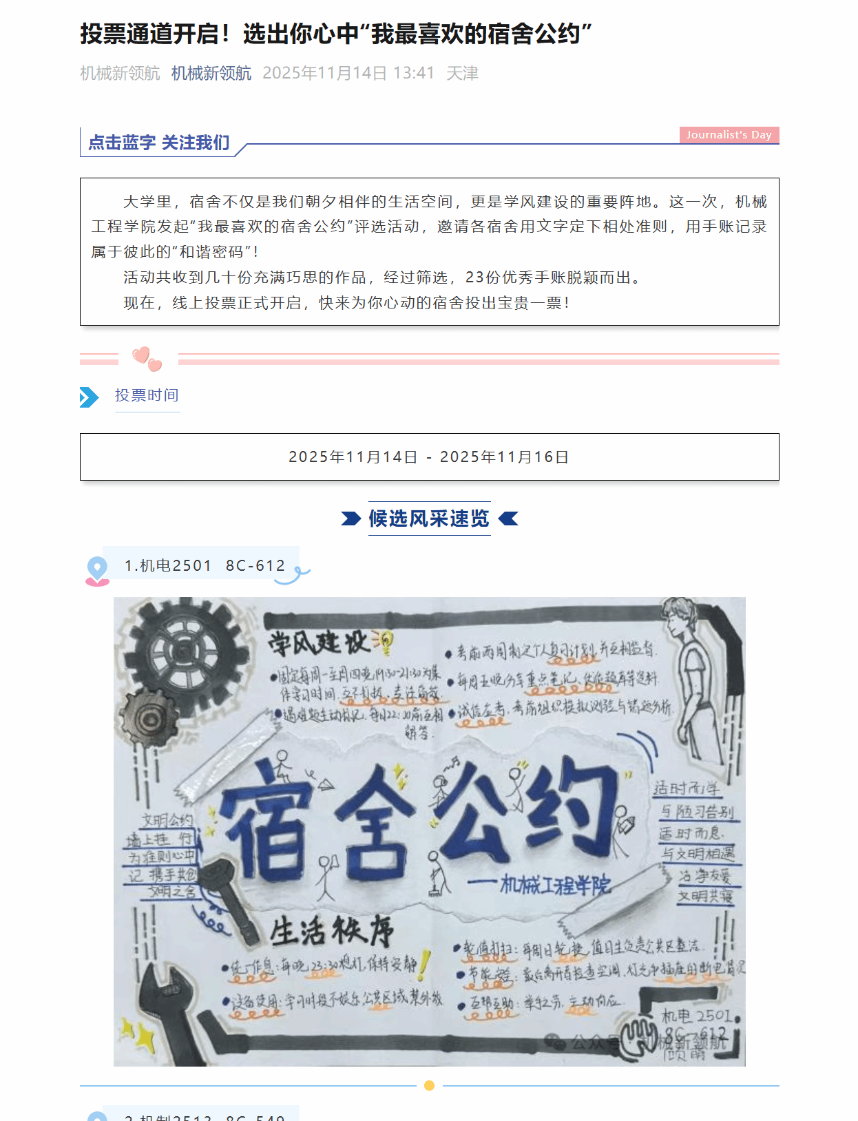 为深化学风建设成果,夯实宿舍育人阵地,11月20日,机械工程学院“我最美的宿舍公约”评选活动圆满落下帷幕。此次活动以创建“守规、勤学、和睦、互助”的宿舍氛围为目标,通过引导学生自主制定宿舍公约,进一步凝聚宿舍力量,让优良学风在宿舍扎根。