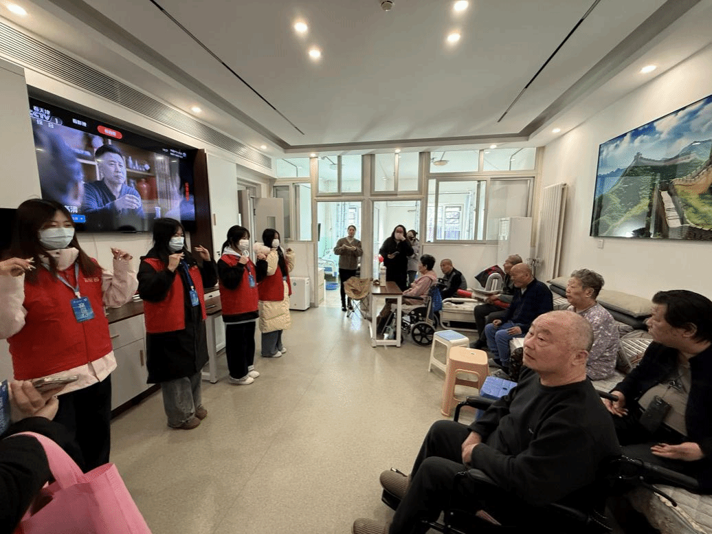 活动伊始,志愿者们为老人精心准备了一场别开生面的文艺汇演。手势舞《党是太阳我是花》以轻柔动作表达真挚情感,《桃花朵朵开》展现出蓬勃的朝气,《强军战歌》唱出铿锵力量,《我爱你中国》传递深切热爱。在志愿者的热情带动下,老人们一同高歌《歌唱祖国》,熟悉的旋律唤起共同记忆,现场洋溢着温暖与感动。