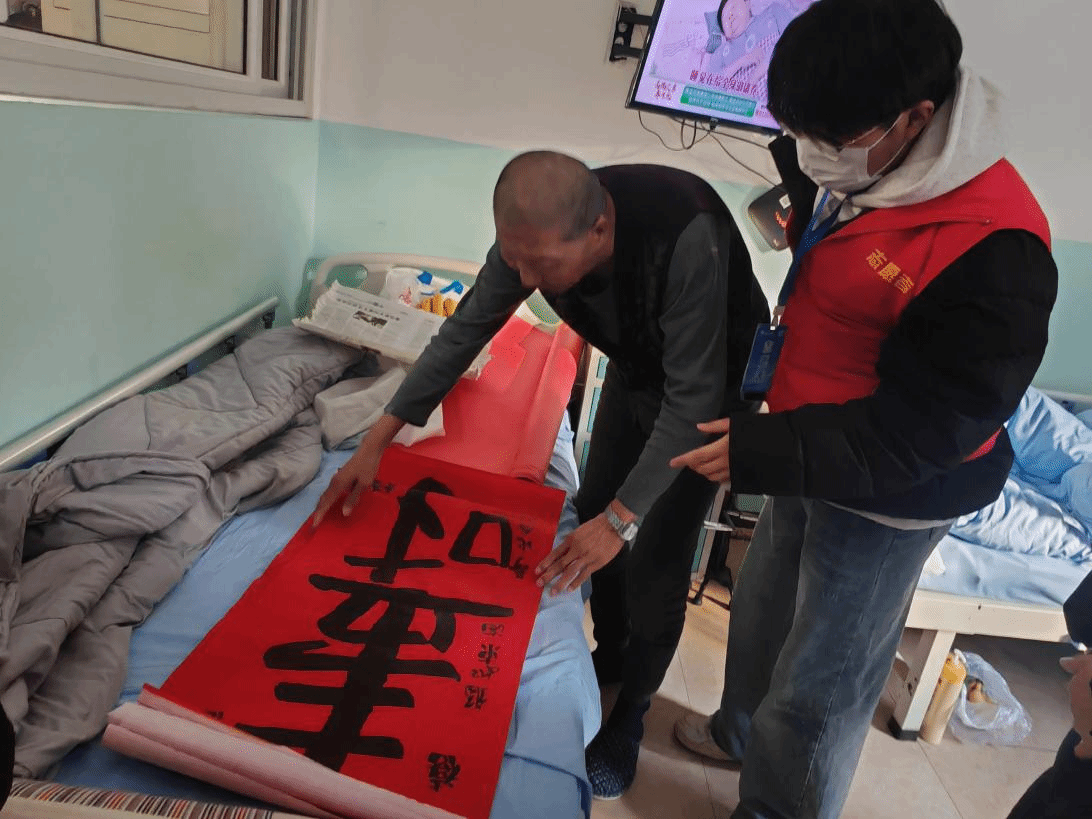 演出结束后,志愿者们分组陪伴老人闲话家常,倾听他们的人生故事与生活感悟。一位热爱书法的老人特别分享了自己书写“寿”字的心得,并现场展示了作品,一笔一画间,不仅承载着对健康长寿的美好祝愿,也体现了传统文化在岁月沉淀中的魅力,让在场的同学们深受触动。老人们娓娓道来的经历与志愿者们的校园生活趣事相互交织,笑声与话语温暖了整个房间。