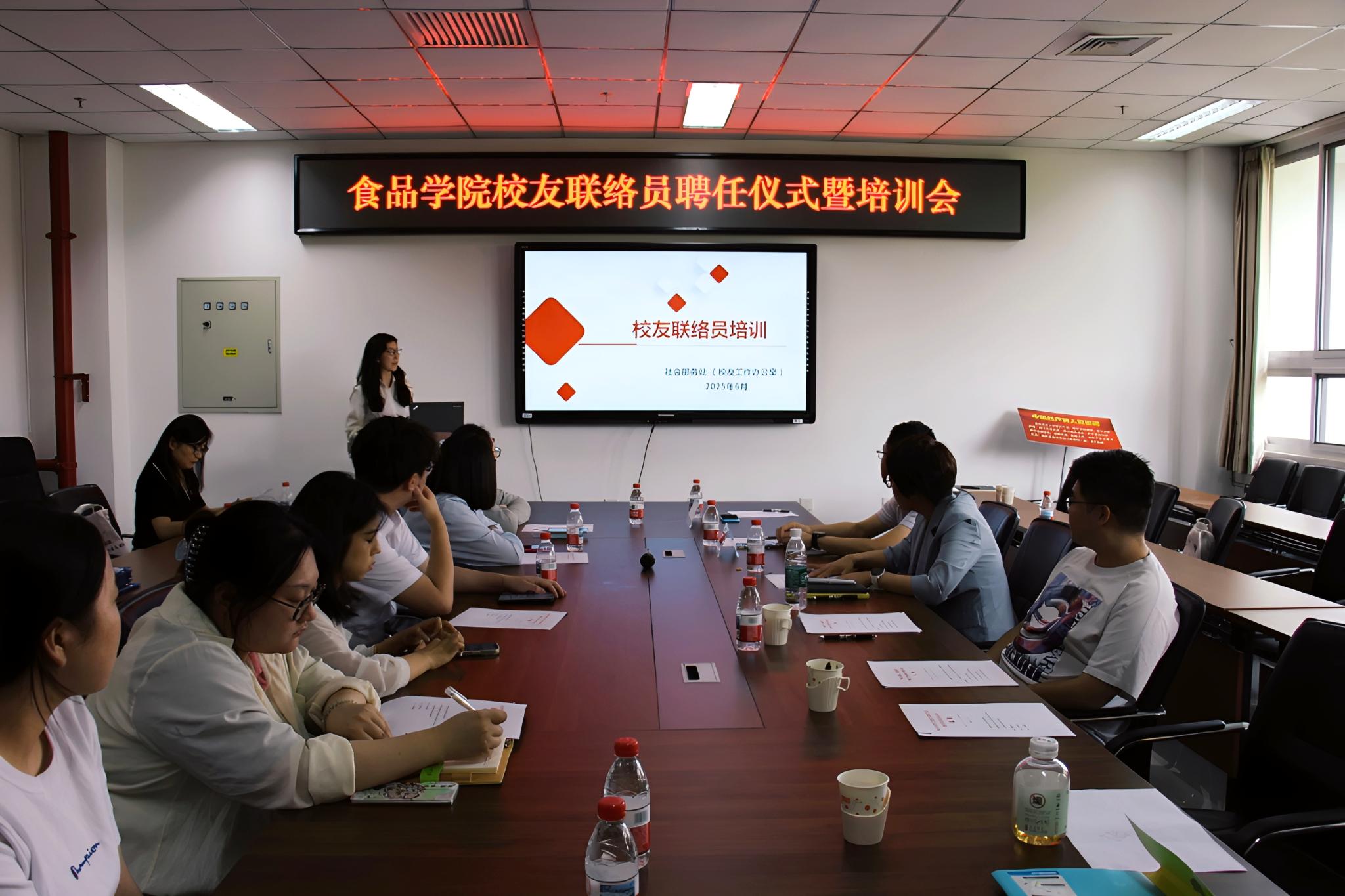 6月19日下午,食品学院举行2025届毕业生校友工作联络员聘任仪式暨工作培训会。学院党委书记靳晓熙,社会服务处副处长陈勇,社会服务处干部赵瑞一,毕业班辅导员及2025届全体毕业生校友联络员参与活动。会议由学院党委副书记张文娜主持。