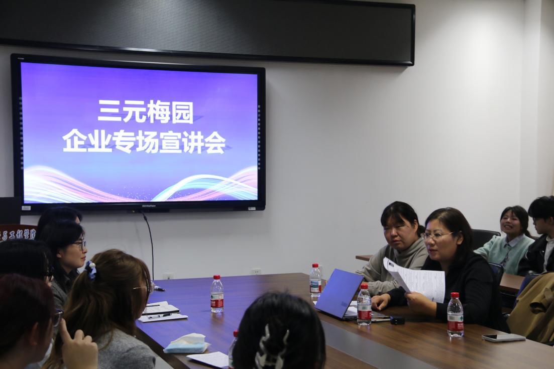 10月18日,食品学院举办了三元梅园企业专场招聘会。三元梅园综合服务中心经理才英翠、品牌市场中心经理王倩、人力专员赵咏琪以及管培生代表,食品学院党委副书记张文娜、辅导员官凌霄共同参加此次会议。