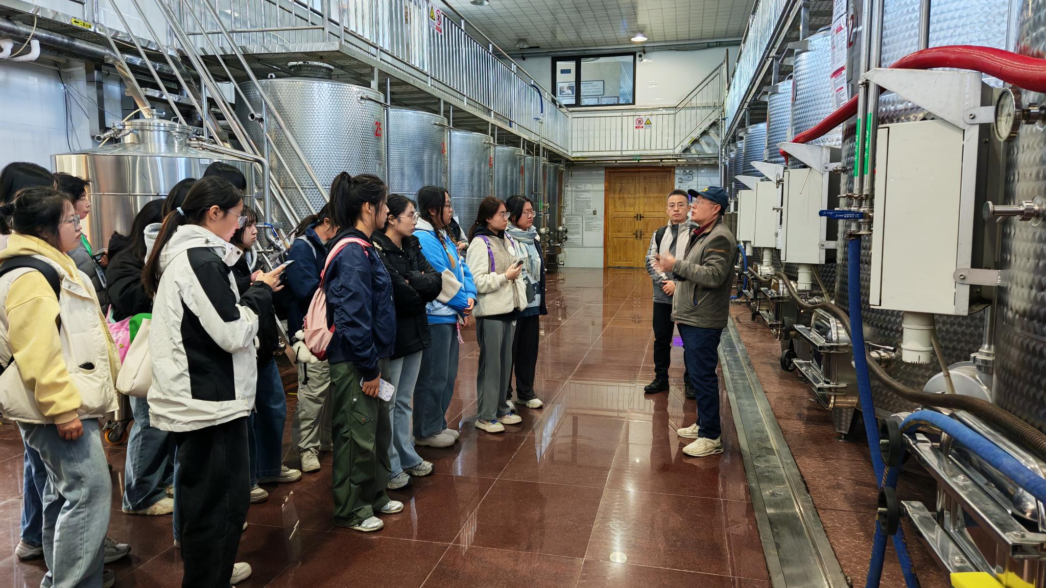 午后的莱恩堡酒庄酿酒车间弥漫着葡萄酒发酵的香气,老师带领同学们依次参观除梗破碎区、发酵罐群、储酒车间和灌装线,系统了解葡萄酒酿造全流程。从葡萄采摘后的分选破皮,到酒精发酵的温度控制,再到苹果酸-乳酸发酵的“风味转化”,同学们将课堂上的理论知识与实际生产环节一一对应。在储酒区,橡木桶的“呼吸作用”和“微氧环境对酒体的影响”让同学们感叹:“原来一瓶优质葡萄酒,从田间修剪到车间陈酿,需要如此多的‘匠心守护’。”