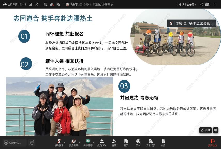 分享环节中,西部计划志愿者、2025届优秀校友刘博宇、马彩平、苏冉依次进行分享,她们结合自身扎根西部的服务经历,生动讲述了自己的工作感悟,深情分享了在基层奉献过程中的成长蜕变与暖心瞬间,用真实的经历、真挚的情感,传递着志愿服务的温度与力量,也为同学们投身西部、发挥专业所长提供了宝贵的实践参考。她们以实际行动证明了在西部基层的广阔天地中,只要脚踏实地、勇于付出,就能实现自己的人生价值,绽放青春光彩。