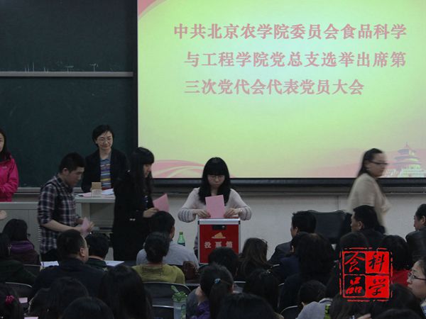 大会共同学习了学校党委《关于中共北京农学院第三次代表大会代表选举工作的通知》文件精神,传达了学校党委《关于同意开云手机站登录入口分党委出席北京农学院第三次党代会代表候选人预备人选的批复》,表决通过了《关于出席北京农学院第三次党代会代表选举办法(草案)》、食品学院12名党代表候选人预备人选名单以及大会监票人(敖日嘎)、计票人(黄漫青、许丽、张巍、袁烁、王煜斐、周渝迪)名单。在监票人的主持下,100名共产党员依次进行投票,共同选举产生了食品学院仝其根等10名代表出席学校第三次党代会。