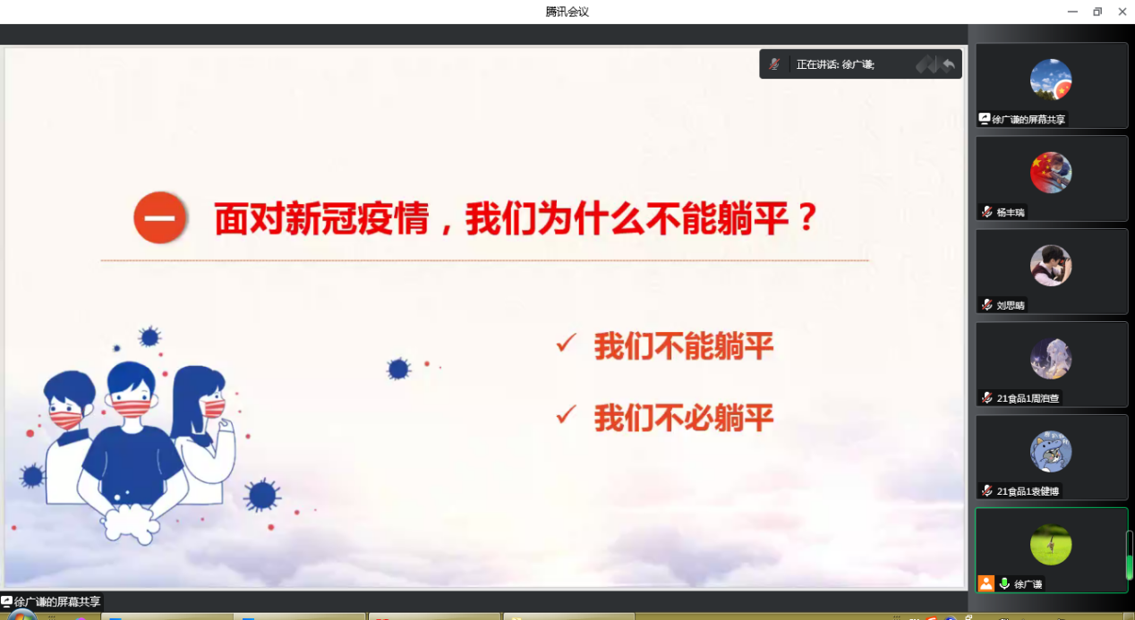 大家通过分析我国历史上的传染病防控经验、现实情况以及三年来疫情防控的效果,详细讲解了我们为何不能躺平、不必躺平,现阶段高校防控政策是严中有变、严中有精、严中有爱,高校疫情防控政策通过不断优化调整、更加精准,充分体现出高校守护师生生命健康的坚定决心。号召广大学生做自身健康的第一责任人,支持学校和属地疫情防控规定,发挥防疫正能量,贡献北农学子力量。