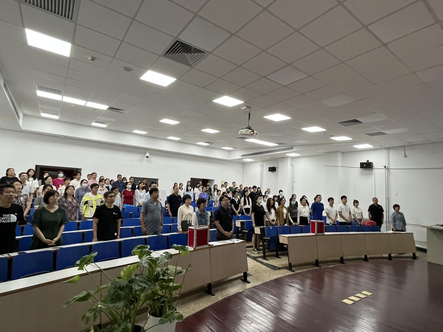 大会在嘹亮的国歌声中拉开序幕,全体师生党员起立,奏唱国歌。