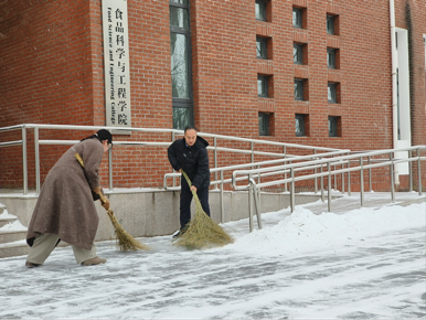 师生忙碌的身影,构成了一道靓丽的风景线,经过几小时的奋力清扫,积雪积冰情况得到缓解,一条条便于行走的道路重新出现在校园内,为师生的出行消除了安全隐患。