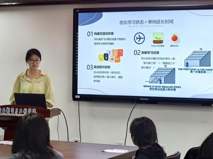 25酿酒1班学风“领航员”、2023级预备党员申雪雪结合自身学习经验梳理了酿酒工程专业课程体系,强调了基础课学习与专业实践融合的重要性;优秀学生代表许会裕则聚焦学习方法,分享了专注力管理、结构化笔记和阶梯式复习等实用经验。