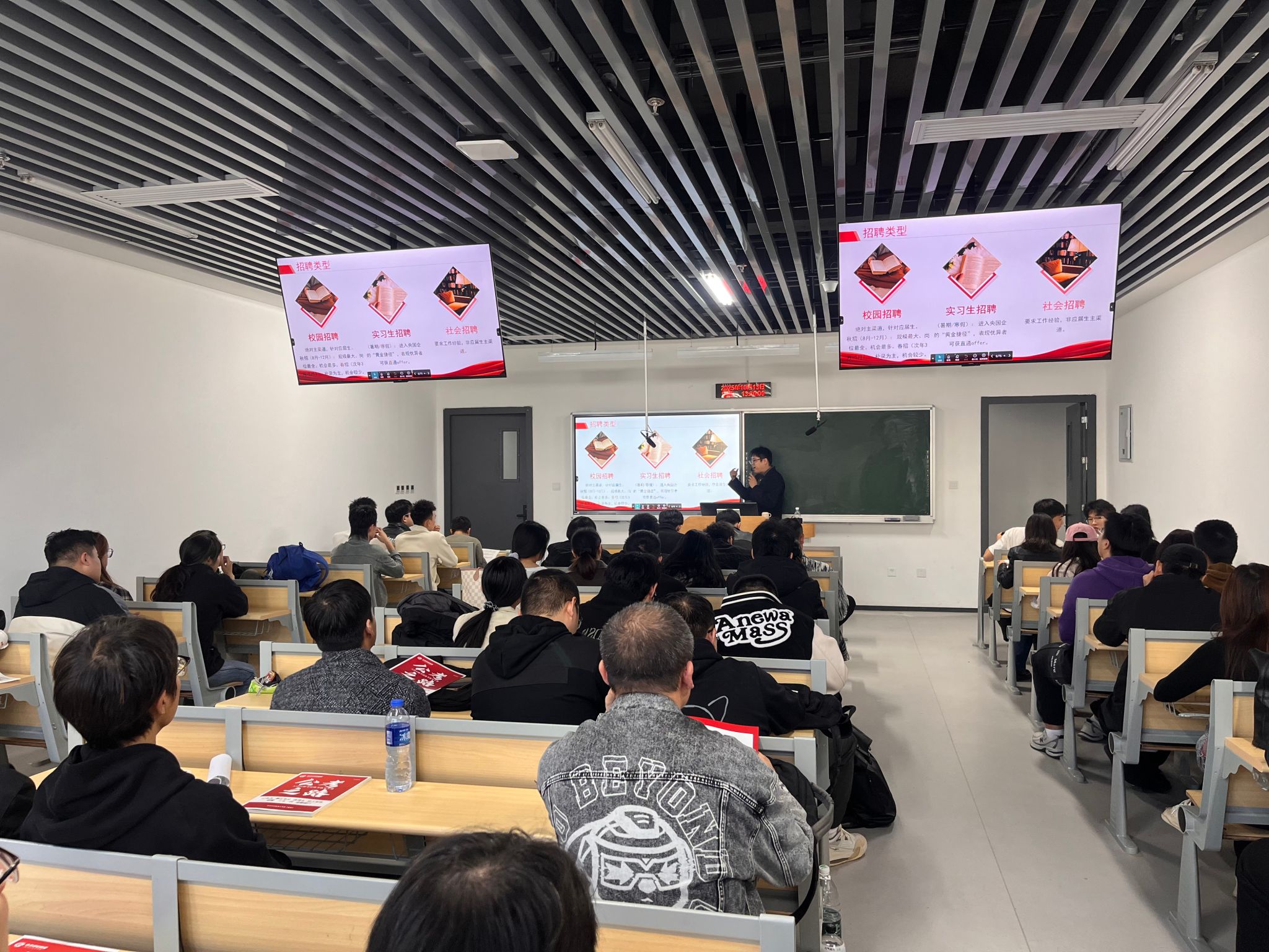 管宏龙围绕行业选择、企业招聘流程、简历制作、面试技巧、机械类专业考公分析等内容开展专题讲座。他结合多年辅导经验,通过生动案例为同学们讲解了求职过程中的实用策略,现场互动积极、反响热烈。