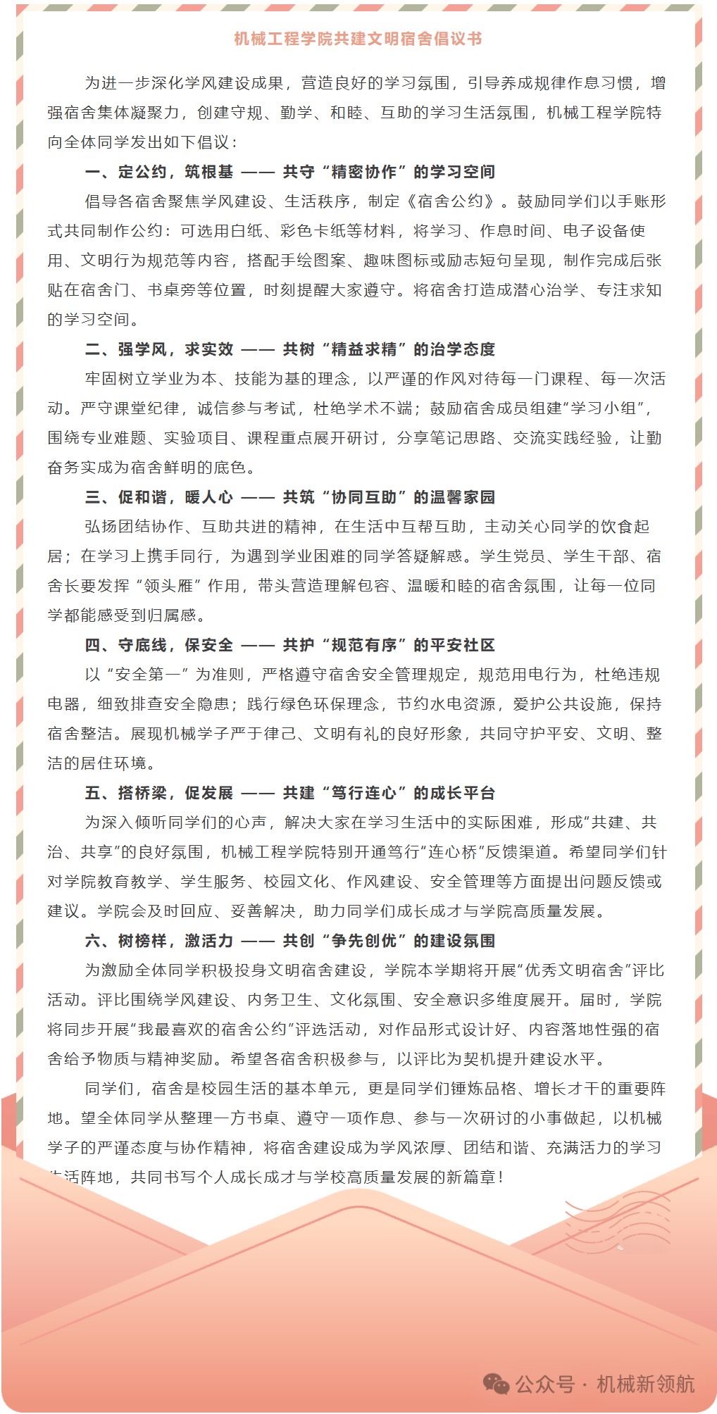 宿舍文明建设是学风建设的重要抓手,此次活动将学风建设从课堂延伸到宿舍,将集体要求内化为自觉行为。接下来,机械工程学院将以此次活动为契机,推广优秀宿舍公约的建设经验,发挥榜样示范作用,持续推进宿舍文化建设,努力营造积极向上、文明有爱的校园氛围,为学生健康成长保驾护航。